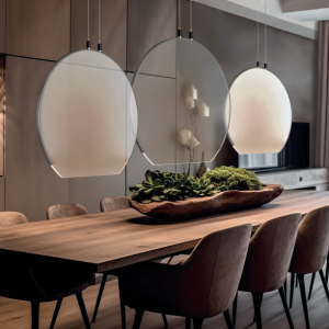 Disponible en dos tamaños, mediano (Ø 60 cm) y grande (Ø 80 cm)y en dos acabados, anillo exterior de oro brillante con el anillo interior de oro mate y con el anillo exterior en negro brillante y con el interior en negro mate. Elara se adapta a una amplia gama de ambientes, como por ejemplo encima de una mesa de comedor en un entorno residencial, o como parte de una instalación más grande en espacios públicos como el salón de un hotel o un restaurante.